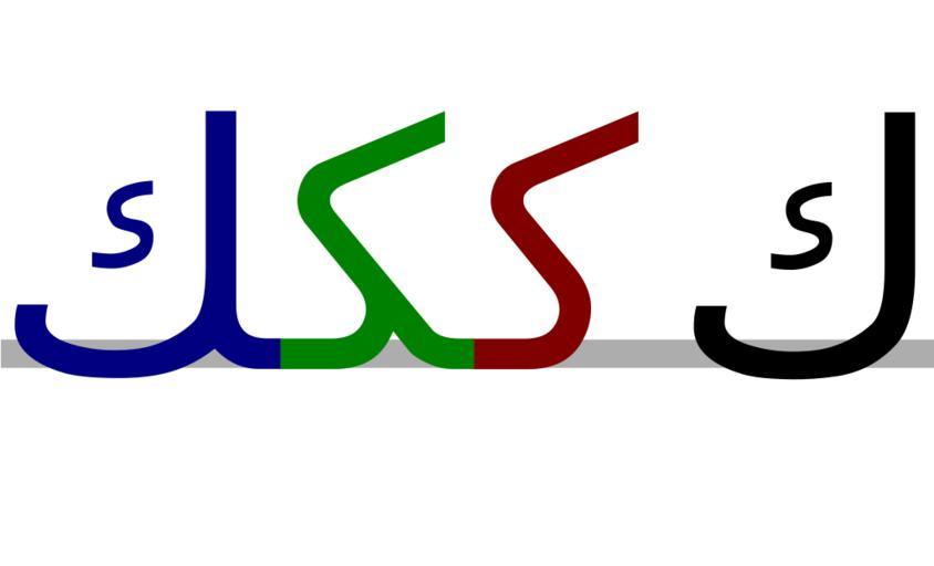 Keywords: Kaf forms with line.svg en Arabic letter kaf<br /> Black isolated form; red initial form; green medial form; blue final form<br /> Font Lucida Sans Unicode own Wickey-nl 2011-04-28 Cc-zero Arabic glyphs with baseline