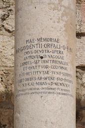 | Keywords: Kafarnaum BW 22.jpg Kafarnaum Synagoge Inschrift an einer Säule Zum frommen Gedenken an Reverendus Pater Gaudentius Orfali vom Orden der Franziskaner durch dessen hingebungsvolle Mühe die Nordsteine der antiken Synagoge und vier Säulen an ihrem Platz wieder errichtet worden sind Er starb zwei Tage nach seinem Werk am 12 vor den Kalenden des Mai am 20 April im Jahr des Herrn 1926 Zu Gefallen Unter dem Beifall der Internationalen Archäologischen Vereinigung das Denkmalsamt Amt zur Pflege und Bewahrung der Altertümer Capernaum Synagogue inscription at a column To the pious memory of the Reverend Father Reverendi Patris Gaudentius Orfalus OFM by whose devout work the northern stones of the ancient synagogue and four columns were restored to their positions He died two days after his work on April 20 1926 own 2010-09-16 Berthold Werner ImageNote 1 311 716 1292 1503 1800 2700 2 PIAE MEMORIAE R P GAUDENTII ORFALI O F M CUIUS DEVOTA OPERA ANTIQUAE SYNAGOGAE LAPIDES SEPTEMTRIONALES ET QUATTUOR COLUMNAE SUIS RESTITUTAE SUNT SEDIBUS OBIT DIEBUS AB OPERE SUO DUOBUS XII KAL MAIAS AD MCMXXVI CONGRESSU ARCHEOL INTERNAT PLAUDENTE MAGISTRATUS ANTIQUITATIBUS CURANDIS TUENDIS Zum frommen Gedenken an Reverendus Pater Gaudentius Orfali vom Orden der Franziskaner durch dessen hingebungsvolle Mühe die Nordsteine der antiken Synagoge und vier Säulen an ihrem Platz wieder errichtet worden sind Er starb zwei Tage nach seinem Werk am 12 vor den Kalenden des Mai am 20 April im Jahr des Herrn 1926 Zu Gefallen Unter dem Beifall der Internationalen Archäologischen Vereinigung das Denkmalsamt Amt zur Pflege und Bewahrung der Altertümer To the pious memory of the Reverend Father Reverendi Patris Gaudentius Orfalus OFM by whose devout work the northern stones of the ancient synagogue and four columns were restored to their positions He died two days after his work on April 20 1926 ImageNoteEnd 1 QualityImage Photographs by User Berthold Werner/Israel Palestina Taken with Pentax K10D Capernaum byzantine synagogue Quality images by User Berthold Werner Quality images of Israel |