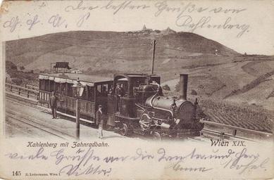 | Keywords: Kahlenberg-1905.jpg Cograil train of the Kahlenberg Railway in Vienna Zahnradbahn auf den Kahlenberg Ansichtskarte 1905 Zug der Zahnradbahn auf den Kahlenberg in Wien historic picture postcard - historische Postkarte ca 1905 Creator Michael Frankenstein PD-old Postcards of Austria before 1918 Steam locomotives of Austria Trains of Austria Kahlenbergbahn Historical images of Döbling Black and white photographs of trains 1905 in Austria 1905 postcards Michael Frankenstein Postcards of steam locomotives |