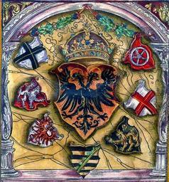 | Keywords: Kaiserwappen des Heiligen Römischen Reichs 1545.jpg Titelseite mit Wappen eines Kaisers des Heiligen Römischen Reiches Deutscher Nation Jacob Koebel Vorrede Wapen Des Heyligen Römischen Reichs Teutscher nation Gedruckt bei Cyriacus Jacob evtl auch Herausgeber/Autor Frankfurt am Main 1545 Holzschnitte von Jacob Kallenberg Zu Angaben zur Tingierung Farbgebung der Wappen siehe das Register ab Bild Nr 165 Coats of arms of an emperor of the Holy Roman Empire Stemma di un Imperatore del Sacro Romano Impero della Nazione Germanica Ге б импе ато а Священной Римской импе ии из династии Габсбу гов Exemplar der Bayerischen Staatsbibliothek http //daten digitale-sammlungen de/bsb00059192/image_7 Scan des MDZ 1545 Text Jacob Koebel oder Cyriacus Jacob Holzschnitt Creator Jacob Kallenberg PD-art-100 <gallery> Wapen 1545 001 jpg </gallery> DEFAULTSORT Holy Roman Emperor Or shield coats of arms of Holy Roman Emperors Crowned lions in heraldry Imperial crowns Wapen des Heyligen Römischen Reichs Teutscher Nation Books in the Bayerische Staatsbibliothek |