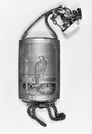 | Keywords: Kajikawa - Inro with Hawk on its Perch and Netsuke with Gama Sennin and a Toad - Walters 67457.jpg This carved ivory netsuke depicts a standing immortal hermit Gama Sennin with his gourd toad and staff on a platform The standard oblong gold lacquer four compartment inro has a slightly rounded body One of the compartments contains red seal-paste The design on each side of the inro is of a hawk on a perch framed in a panel The design is in high relief early Other date century 19 late Edo gold red and silver lacquer silver ivory silk cm 8 7 5 3 2 2 accession number 67 457 9947 Wakai Kanesaburo Centennial Exhibition Philadelphia 1876 William T Walters city Baltimore Henry Walters city Baltimore Walters Art Museum Henry Walters Acquired by William T Walters 1876 Seal In red on bottom of lower case Ei; Signature In gold on bottom of lower case Kajikawa saku Centennial Exhibition Philadelphia Memorial Hall Philadelphia Philadelphia 1876 place of origin Japan Walters Art Museum license Inro in the Walters Art Museum Media from the Walters Art Museum no creator template Netsuke Hawks in art |