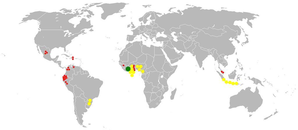 | Keywords: Kakaobohnenanbau 2005.PNG  bubble map shows the global distribution of cocoa bean output in 2005 as a percentage of the top producer Côte d'Ivoire - 1 286 330 tonnes Legend Cocoa output in 2005 shown as a percentage of the top producer Cote d'Ivoire - 1 286 330 tonnes Notes on the technical realization and data source of the map en This map is consistent with incomplete set of data too as long as the top producer is known It resolves the accessibility issues faced by colour-coded maps that may not be properly rendered in old computer screens Data was extracted on 18th June 2007 from http //faostat fao org/site/336/DesktopDefault aspx PageID 336 009240 100 green fff500 10 yellow da251d 1 red 2005cocoa_bean PNG 50 2012-02-17 15 09 UTC 2005cocoa_bean PNG BlankMap-World png The map was made by User Vardion and adapted by User E Pluribus Anthony for Wikipedia derivative work Anwar saadat derivative work Generator deleting legend Generator 2005cocoa_bean PNG Vardion E Pluribus Anthony Anwar saadat and Generator Original upload log This image is a derivative work of the following images File 2005cocoa_bean PNG licensed with PD-author 2011-07-01T16 50 10Z Saibo 1425x625 59340 Bytes <nowiki>raw descs This bubble map shows the global distribution of cocoa bean output in 2005 as a percentage of the top producer Côte d'Ivoire - 1 286 33</nowiki> Uploaded with derivativeFX Bubble maps Cocoa production Economic maps of the world Maps with Robinson projection |