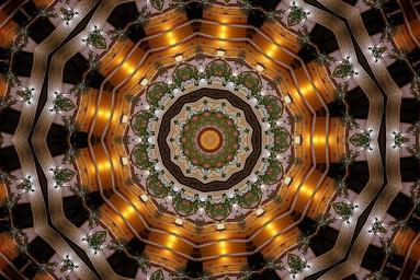 Keywords: kaleidoscope graphics composition wheel the centre of circular sharpness the details of the minor elements shaded orange black central arrangement of radially ornament wallpaper