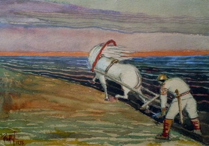 Keywords: Kalevipoeg kündmas.promet.jpg et Kalevipoeg kündmas Akvarell http //www haus ee/teose popup php s pilt z 680 kon 1 form 0 Creator Aleksander Promet 1934 PD-old Aleksander Promet Kalevipoeg