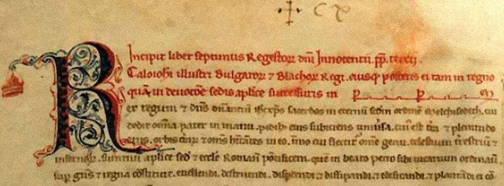| Keywords: KaloyanInnocent.jpg папа Инокентий ІІІ и бълга ския ца Калоян Детайлът съдъ жа фо мулата Калоян ца на бълга и и власи О игиналът се съх анява в Сек етния а хив на Ватикана http //www zabukvite org/issues 22 zabukvite org Secretary of Innocent III 12th-13th centuries PD-Art Innocentius III in miniatures Kaloyan of Bulgaria Illuminated archival materials |