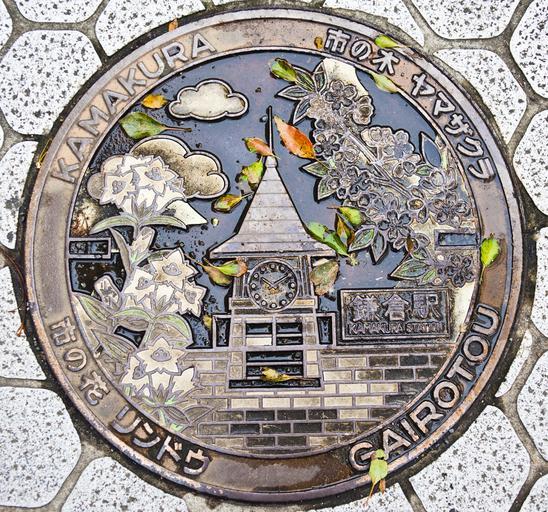 Keywords: Kamakura's Manhole.jpg en AN elaborately decorated manhole in Kamakura Kanagawa own Urashimataro 2009-10-25 Public Domain Kamakura Kanagawa Manhole covers in Kanagawa prefecture