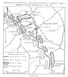 | Keywords: Kamenev map 9.jpg en Polish-Soviet front 8 08 1920 ru Положение сто он на польском ф онте к 8 августа 1920 г Выход К асной А мии на Западный Буг С С Каменев Бо ьба с белой Польшей Военный вестник 1922 N12 ст 7-17 Записки о г ажданской войне и военном ст оительстве Воениздат 1963 С С Каменев 1922 PD-old Maps of the Polish-Soviet War |