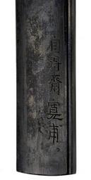 | Keywords: Kanpo - Kozuka with a Fan, Medicine Box, Tabacco Pouch, and Netsuke - Walters 51697 - Mark A.jpg This kozuka is surrounded with a raised rim and the background Inside this frame are objects typically carried by men during the Edo period At the right is a fan made of tortoise shell and ivory Next to that in a medicine box inro which was used to carry other small objects in addition medicine Beside the medicine box is a tobacco pouch Both of these objects are attached to a gourd shaped netsuke made of coral The netsuke served as a counterweight to attach the medicine box and the tobacco pouch to the belt of a kimono The kozuka is signed on the back century 19 Edo-Meiji shakudo gold copper coral tortoise shell ivory cm 9 5 accession number 51 697 22240 Henry Walters Baltimore date and mode of acquisition unknown Walters Art Museum Henry Walters Acquired by Henry Walters Signature Jitokusai Kanpo place of origin Japan Walters Art Museum license Tosogu Japanese sword fittings in the Walters Art Museum Kanpo Media contributed by the Walters Art Museum needs category review Media contributed by the Walters Art Museum needs artist update |