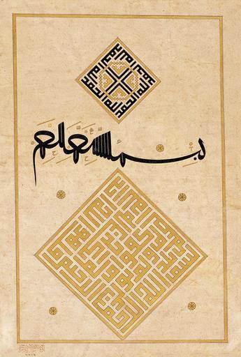 | Keywords: Karahisari.jpg en Right part of a double-page frontispiece to a manuscript of religious texts penned for Süleyman I de Rechter Teil einer Anfangs-Doppelseite eines Manuskriptes für den osmanischen Sultan Süleyman I Die quadratischen ma'qili erinnern an mongolische Stempel die mögliche Vorbilder für mogulische Tughras waren Das obere ma'qili enthält alhamd lillah das untere die Sure 112 Dazwischen in schwarzer geketteter Schrift das basmala Istanbul TIEM 1443 fo 3b Ahmad Karahisar ca 1550 Assessments 1 PD-old Tughra Basmala in Arabic calligraphy Arabic calligraphy/Qur'an Islamic illumination Kufic style |