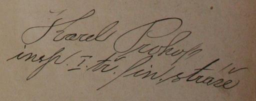 | Keywords: Karel.Prokop.(1893-1943).Podpis.gif cs Podpis rok 1941 osoby Karel Prokop 1893 - 1943 - za první světové války příslušník československých legií v Rusku; za protektorátu přednosta a inspektor Finančního úřadu potravní daně a zároveň vedoucí odbojové skupiny v Praze Jinonicích jakož i zástupce velitele ilegální skupiny Vašek-Čeněk Po zátahu gestapa na jinonický akcíz 4 října 1941 přešel do ilegality a ukrýval se na plzeňsku kde používal falešné doklady na jméno Karel Kropáček Zatčen gestapem 4 července 1942 v Plzni - Skvrňanech Popraven dne 8 září 1943 ve věznici v Berlíně-Plötzensee en Signature 1941 of person Karel Prokop 1893 - 1943 During the First World War he was a member of the Czechoslovak legions in Russia During the protectorate he was a chief inspector of the Tax Office and excise taxes and he was also leader of resistance group in Prague Jinonice and also he was a deputy commander of an illegal group Vašek-Čeněk After the gestapo made an attack on the Jinonice excise duty office 4 October 1941 he went underground and he hid himself in around Pilsen where he used false documents in the name of Karel Kropáček Arrested by the Gestapo July 4 1942 in Pilsen - Skvrňany Executed to death on September 8 1943 in the prison in Berlin-Plötzensee 1941-04-30 CZ Volně přístupné archivy České republiky <br/> EN Freely accessible archives of the Czech Republic CZ Autorem tohoto dokumentu je neznámá osoba <br/> EN Author of this document is unknown person other versions Custom license marker 2016 04 30 anonymous-EU/cs PD-old PD-CzechGov Heroes Protectorate of Bohemia and Moravia Karel Prokop |