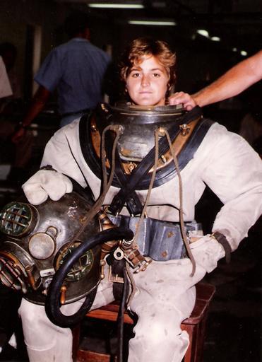 | Keywords: Karen Kohanowich.jpg Karen Kohanowich former U S Navy Salvage Diver Acting Director of NOAA's National Undersea Research Program NURP and NEEMO 10 aquanaut wearing a Mark V diving rig during her service in the Navy http //www history navy mil/museums/keyport/womendivers/Photos/Kohanowich_MkV jpg U S Navy PD-USGov-Military-Navy Karen Kohanowich Standard diving dress Women looking at viewer | ||||