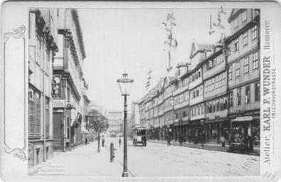 | Keywords: Karl F. Wunder Momentaufname 1890 Calenberger Strasse mit Pferde-Omnibus Blick in Richtung Marktkirche Hannover.jpg Blick durch die Calenberger Straße in Hannover in Richtung Altstadt/Marktkirche laut den Blindstempeln eine sogenannte Moment-Aufnahme aus dem Jahr 1890 durch den Fotografen Karl Friedrich Wunder Gut zu erkennen sind - beiderseits des durch die Straße fahrenden Pferdeomnibusses - die vornehmlich in Fachwerkbauweise seit dem 17 Jahrhundert errichteten Gebäude darunter etwa das Geburtshaus des Dichters Johann Anton Leisewitz heutige Calenberger Straße 15 Die enge Bebauung mit den leicht brennbaren Baumaterialien war einer der Gründe weshalb in der Calenberger Neustadt nur so wenige Gebäude die Luftangriffe auf Hannover im Zweiten Weltkrieg überdauerten Gernot Becker Norderstedt http //gebe paperstyle de/familienstamme/b/becker-stammfolge/32-becker-ernst-august/ ~ 1890 Creator Karl Friedrich Wunder PD-old Copyrighted free use Karl Friedrich Wunder 1890 in Hannover Calenberger Straße Hannover Horse-drawn buses in Germany Johann Anton Leisewitz |