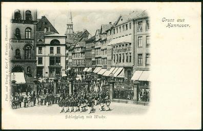 | Keywords: Karl F. Wunder PC Gruss aus Hannover. Schloßplatz mit Wache. Bildseite Blick vom Leineschloss zum Holzmarkt Louis Heermann Oscar Winter Gebrüder Bengen Kapelle Pickelhaube Knackstedt & Näther.jpg Blick vor 1896 vom Leineschloss auf den schon damals umzäunten Schlossplatz auf dem vom Holzmarkt und von der Leinstraße eine mit Pickelhauben geschmückte musizierende Militärkapelle einmarschiert beobachtet von zahlreichen Kindern und Bürgern Hannovers An der Schlossstraße ist das Gebäude mit der Aufschrift Louis Heermann zu erkennen Hinter dem Holzmarkt auf dem hier der Holzmarktbrunnen augenscheinlich noch nicht aufgestellt wurde ist an der Pferdestraße wo sich heute das Historische Museum Hannover befindet die Eisenwarengroßhandlung von Oscar Winter zu erkennen In der Bildmitte schaut im Hintergrund die Turmspitze der Kreuzkirche über die Dächer Am rechten Bildrand findet sich das Geschäft der Gebrüder Bengen Dieses Dokument wurde freundlicherweise von Heralde Schmitt-Ulms zum Scannen geliehen um es als Digitalisat bei Commons nachhaltig allen Menschen zu Bildungszwecken zur Verfügung zu stellen Scan vom Original Bernd Schwabe in Hannover ~ 1895 Creator Karl Friedrich Wunder PD-old Documents by Heralde Schmitt-Ulms Numbered postcards by Karl Friedrich Wunder Knackstedt Näther Oscar Winter Schloßstraße Hannover Children in Hannover Leinstraße Hannover Military in Hannover Music of Hannover Leineschloss Schloss- und Stadtkirche St Crucis Hannover Holzmarkt Hannover |