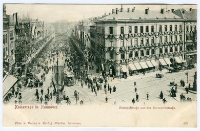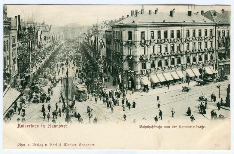 | Keywords: Karl F. Wunder PC 0555 Kaisertage in Hannover, Bahnhofstraße von der Karmarschstraße.jpg de žPhot u Verlag v Karl F Wunder Hannover ; žKaisertage in Hannover Bahnhofstraße von der Karmarschstraße laufende Karten-Nummer 555 <br /> Die ab 1890 žKönigliche Haupt- und Residenzstadt Hannover im Festschmuck anläßlich des Besuches von Kaiser Wilhelm II <br /> Dieses Foto ist Teil einer numerisch eingeordneten Serie von Ansichtskarten mit der Karl F Wunder den Aufwand der Stadt für die žKaisertage dokumentierte Die Serie umfasst Bilder vom Hauptbahnhof über den Marktplatz und durch die ganze Stadt bis zum seinerzeit selbständigen Linden Hier fotografierte der geschäftstüchtige Postkarten-Herausgeber vom ehemaligen žHotel Continental am heutigen Kröpcke In Richtung des Hauptbahnhofes sieht man “ auf der im Lichtdruck hergestellten Ansichtkarte nur schwach zu erkennen “ ein riesiges Empfangstor für den Kaiser Der ist auf diesem Bild nicht anwesend sonst würde auch die Straßenbahn nicht in die Bahnhofstraße einfahren Die Menschenmenge bestaunt wohl eher die großenteils abgeschlossenen Vorbereitungen für den Kaiserbesuch Zuvor waren die Bürger aufgefordert zuvorderst die Geschäftsleute ihre Häuser so reichhaltig wie möglich zu schmücken Auf der linken Seite sieht man ein besonders reichhaltig behangenes Haus Die unregelmäßig langen Stangen oben am Dach weisen auf ein Baugerüst hin das seinen den Blicken des Kaiser wohl nicht würdigen Anblick hinter besonders viel Tamtam verbirgt Am Eckhaus auf der rechten Seite erkennt man den Schriftzug der Buchhandlung žC Schrader's Nachfolger ein Stückchen weiter warten offene Kutscher mit offenem Gespann auf Kundschaft aus dem Café Kröpcke Scan vom Original der mir vorliegenden Ansichtskarte Creator Karl Friedrich Wunder 1898 PD-old Numbered postcards by Karl Friedrich Wunder Wilhelm II of Germany in 1898 Kröpcke Hannover Trams in Hannover Bahnhofstraße Hannover Rathenaustraße Hannover Kaisertage in Hannover 1898 Julius Trip |