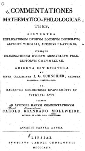 | Keywords: Karl Mollweide.png en Frontpage of Commentationes mathematico-philologicae 1813 by Carl Mollweide 1774-1825 1813 Google books https //books google cat/books id xgMGs_lh8bwC Karl Brandan Mollweide 1774-1825 other versions Custom license marker 2016 03 21 pd-old-100-1923 Covers of books about mathematics Mathematicians from Germany 1774 births 1825 deaths 1813 books |