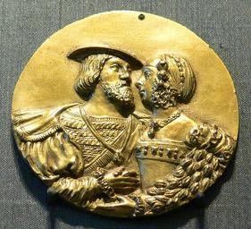 | Keywords: Karl V und Isabella BNM 30-1634.jpg Kaiser Karl V und seine Gemahlin Isabella von Portugal; Augsburg 1526 “1529 <br />Kupfer vergoldet <br />Bayerisches Nationalmuseum München Inv Nr 30/1634 own 2009 Anonymous Photo User FA2010 Sculptures in the Bayerisches Nationalmuseum 16th-century relief portraits Medals of couples 1634 Copper objects Charles V Holy Roman Emperor on medals Isabella of Portugal in medals 1520s medals Profile medals of men with cap facing right 1520 Women with cap on medals 1520 Profile medals of women facing left 1520 |