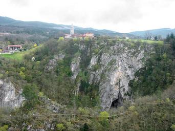 | Keywords: Karst under Skocjan.jpg Village Skocjan Divača Slovenia River Reka; resurges twice from under the Karst rockformations <br> In front below View into first of 2 huge collapsed parts of cave Skocjanske jame Mala Dolina River and cave are under UNESCO World Heritage Sites protection Oben das Dorf Skocjan unten Blick in das erste Mala Dolina der beiden eingestürzten Teile der sehr großen Karsthöhle Skocjanske jame Die Felsöffnung ist der erste große Ponor von 3 durch welchen der Fluss Reka sich seinen Weg bahnt bevor er in der Höhle von Škocjan verschwindet und 38km im slovenischen Kras -Gebirge unterirrdisch fließt Die Höhle ist durch die Liste des Weltkultur- und Naturerbes der UNESCO geschützt see author 2007-03-31 Mircea_Ardelean Carst01 jpg Škocjan Divača Škocjan Caves Entrances to Škocjan Caves |
