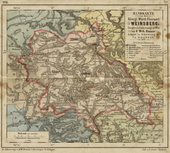 Keywords: Karte Oberamt Weinsberg.jpg Karte des Oberamts Weinsberg ca 1880 Höhenangaben in Metern Map of the Oberamt Weinsberg Weinsberg district c 1880 Heights are given in metres Georg Wilhelm Bauser Hand-Atlas von dem Königreiche Württemberg Stuttgart 1882 ca 1880 Georg Wilhelm Bauser Scanned by Rosenzweig PD-Art Weinsberg 19th-century maps of Baden-Württemberg 1880s maps |