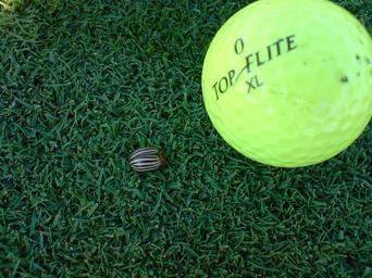 | Keywords: Kartoffelkäferchen.JPG en Little colorado potato beetle on the putting green of a golf course near Bamberg/Germany de Ein kleiner Kartoffelkäfer auf dem Grün eines Golfplatzes in Pottenstein own Hafenrichter Leptinotarsa decemlineata Golf balls Balls on grass High-visibility yellow Yellow objects |