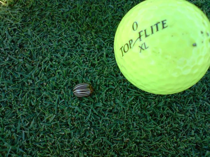 Keywords: Kartoffelkäferchen.JPG en Little colorado potato beetle on the putting green of a golf course near Bamberg/Germany de Ein kleiner Kartoffelkäfer auf dem Grün eines Golfplatzes in Pottenstein own Hafenrichter Leptinotarsa decemlineata Golf balls Balls on grass High-visibility yellow Yellow objects |