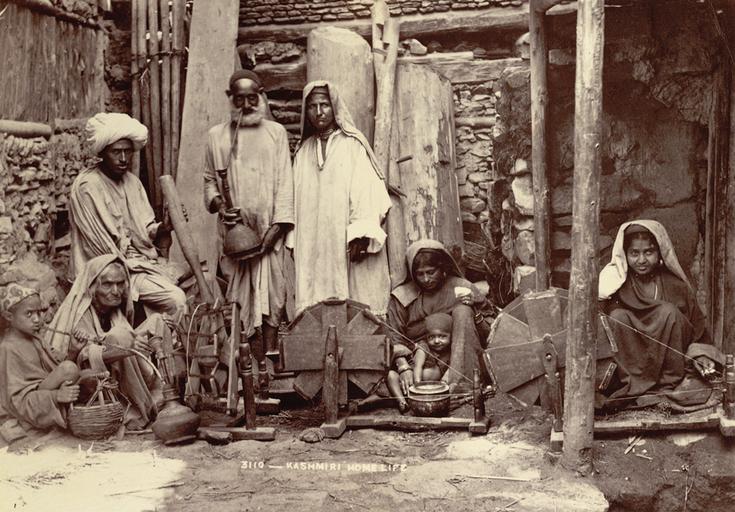 | Keywords: Kashmiri home life, 1895 (Photo 15-10-23).jpg Artwork en Photograph of a Kashmiri family group in the modern-day state of Jammu and Kashmir taken by an unknown photographer in the 1890s Jammu and Kashmir is a Himalayan region in north-western India famous for its lovely mountain scenery and lakes Kashmiris work mainly on the land producing crops and tending animals Kashmir is also famous for its woollen textiles and the people produce fine shawls and carpets still using traditional methods going back centuries The three seated women in the photograph are working on hand-operated charkhas or spinning-wheels; the right hand turns the handle and the left spins the thread onto the reel 1895 Photographic print 141x201 mm Institution British Library object history credit line Held and digitised by the British Library accession number Photo 15/10 23 British Library image Photo 15/10 http //www bl uk/onlinegallery/onlineex/apac/photocoll/k/019pho000015s10u00023000 html PD-old-70-1923 British Library Photo 15 Elgin Collection 1895 in India History of Kashmir Spinning wheels |