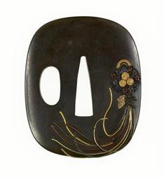 | Keywords: Kato Teruaki - Tsuba with a Hanging Bouquet ("Kusudama") - Walters 51129.jpg On the right of this tsuba is a flower cluster also called a medicine ball kusadama These balls are used as part of the traditional decoration for the Boy's Festival on May 5th Brocade bags of fragrant herbs such as musk and cloves were bound together with flowers and streamers They were hung in homes to ensure long life Along the lower left edge on the back is a blind trimmed in fabric middle Other date century 19 late Edo shibuichi gold copper at center cm 6 17 5 04 0 4 accession number 51 129 38385 Henry Walters Baltimore date and mode of acquisition unknown Walters Art Museum Henry Walters Acquired by Henry Walters Signature Ichijuken Teruaki place of origin Edo present-day Tokyo Japan Walters Art Museum license Tsuba in the Walters Art Museum Kato Teruaki Media contributed by the Walters Art Museum needs category review |