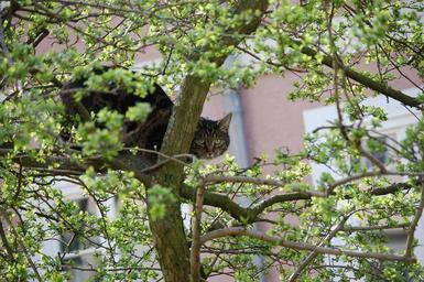 Keywords: Katze-im-baum.JPG A domestic cat Felis silvestris libyca on the branches of a hawthorn Cratægus sp in a urban setting 2006-04-22 own assumed Kintaiyo Cats in trees Hunting cats Unidentified Crataegus Animals with Crataegus