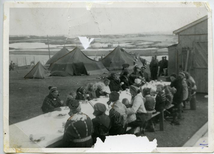 Keywords: andre verdenskrig andreverdenskrig frigjøring feiring vårslipp 2015 vårslipp2015 kautokeino / guovdageainnu kautokeinoguovdageainnu finnmark norge Original bildetekst: Vi stekte vafler, dekket bord ute, kokkene som bor i teltene her, kokte kakao, ellers hadde vi en pakke kjeks, og en plate melkesjokolade til hver. Gjestene kom og man gikk til bords, barn i alle aldre. Fotografiet kommer fra et album gitt til Riksarkivet av sykepleier Marie Lysnes. Våren 1945 deltok hun i opprettelsen av et feltsykehus i Finnmark. Lysnes dokumenterte oppholdet i Finnmark gjennom tekst og bilder. Albumet er en del av privatarkivet etter Marie Lysnes. Arkivreferanse: PA-0873: Lysnes, Marie, Riksarkivet. Original bildetekst: Vi stekte vafler, dekket bord ute, kokkene som bor i teltene her, kokte kakao, ellers hadde vi en pakke kjeks, og en plate melkesjokolade til hver. Gjestene kom og man gikk til bords, barn i alle aldre. Fotografiet kommer fra et album gitt til Riksarkivet av sykepleier Marie Lysnes. Våren 1945 deltok hun i opprettelsen av et feltsykehus i Finnmark. Lysnes dokumenterte oppholdet i Finnmark gjennom tekst og bilder. Albumet er en del av privatarkivet etter Marie Lysnes. Arkivreferanse: PA-0873: Lysnes, Marie, Riksarkivet.
