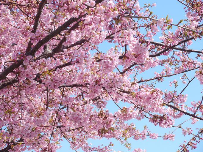 Keywords: kawazu cherry izu izu peninsula pink early spring blue sky in full bloom bud antomasako shizuoka prefecture japan vivid crisp early flowering sky blue