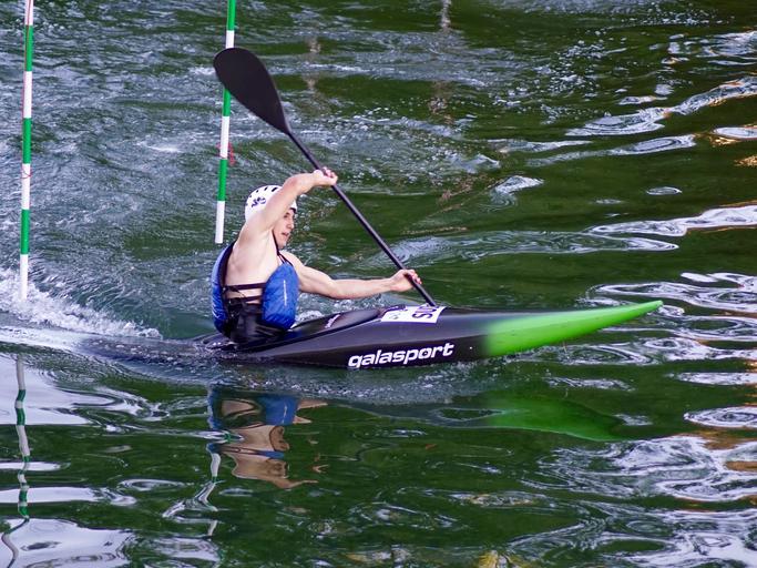 Keywords: kayak white water water sports man young sporty dynamic rowing