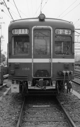 Keywords: Keikyu 1166 at Shinmachi.jpg ja 新町 車区 車中の1166号車 密 化準備工事施工直後 施工後次回の重要部または全般 査施工までは撤去されたジャンパ栓受けが残っていた en Keikyu 1166 at Kanagawa Shinmachi just after the modification to prepare the replacement of couplers A bracket to hold jumper cables were remained until the next heavy inspection 1986-04 own Hahifuheho cc-zero Uploaded with UploadWizard 1986 in rail transport in Japan Black and white photographs of Japan in the 1980s Black and white photographs of trains in Japan Keikyu 1000 series Kanagawa-Shinmachi Station Number 1166 on vehicles |