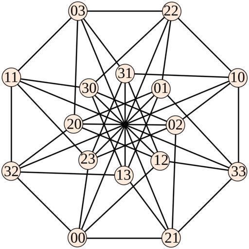 | Keywords: Keller-labeled Clebsch.svg Clebsch graph labeled for the reduction of Keller's cube-tiling conjecture to a graph clique problem by Corrádi and Szabó This graph represents the two-dimensional case of the conjecture and the truth of the conjecture for this case follows from the fact that it has no four-vertex clique more strongly it has no triangle However the graphs resulting from higher dimensional versions of the conjecture have large cliques from which it follows that the conjecture it is false 2011-10-05 own David Eppstein cc-zero Files by User David Eppstein from en wikipedia 5-regular Clebsch graph |