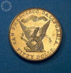 | Keywords: legendary coins legendarycoins numismatics money smithsonian probably public domain probablypublicdomain circle round indoor dial ancient SI Neg. 2005-27365. Date: 9/1/2005...As early as 1850, agitation began in Congress for the establishment of a San Francisco branch of the United States Mint. This action was blocked by people from New York-who wanted a branch in their own state-and from Louisiana and Georgia-who argued that any California operation would represent unfair competition to the branch mints in New Orleans and Dahlonega..The opposition won, and San Francisco went without a branch mint for another four years. But it did get an odd sort of hybrid, the United States Assay Office of Gold, striking an odd sort of money-a gigantic-fifty-dollar ingot that also did duty as a coin. .In addition to the Assay Office, other California coiners toyed with the idea of striking fifty-dollar gold pieces. One group, headed by J. G. Kellogg and G. F. Richter went so far as to have dies for circular slugs prepared and a dozen or so proofs struck from those dies. .But by the time the project had gone forward that far, the federal branch Mint at San Francisco was finally coming into full production. Soon California private gold coinage, no matter how large or small the denominations, became irrelevant..Click here to view the reverse...Credit: Tom Mulvaney (Smithsonian Institution) SI Neg. 2005-27365. Date: 9/1/2005...As early as 1850, agitation began in Congress for the establishment of a San Francisco branch of the United States Mint. This action was blocked by people from New York-who wanted a branch in their own state-and from Louisiana and Georgia-who argued that any California operation would represent unfair competition to the branch mints in New Orleans and Dahlonega..The opposition won, and San Francisco went without a branch mint for another four years. But it did get an odd sort of hybrid, the United States Assay Office of Gold, striking an odd sort of money-a gigantic-fifty-dollar ingot that also did duty as a coin. .In addition to the Assay Office, other California coiners toyed with the idea of striking fifty-dollar gold pieces. One group, headed by J. G. Kellogg and G. F. Richter went so far as to have dies for circular slugs prepared and a dozen or so proofs struck from those dies. .But by the time the project had gone forward that far, the federal branch Mint at San Francisco was finally coming into full production. Soon California private gold coinage, no matter how large or small the denominations, became irrelevant..Click here to view the reverse...Credit: Tom Mulvaney (Smithsonian Institution) |