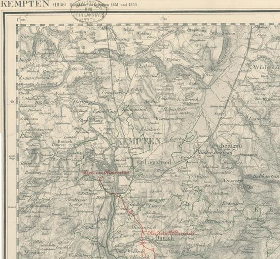 Keywords: Kempten 1853.jpg de Topographischer Atlas vom Königreiche Baiern Blatt Kempten 1836 Eisenbahn nachgetragen 1851 und 1853 Maßstab 1 50 000 http //bvbm1 bib-bvb de/webclient/DeliveryManager custom_att_2 simple_viewer pid 226711 res 2 x 1779 y 2497 Topographisches Bureau München reducirt und gezeichnet von Lieut Lau Berge gezeichnet von OberLieut von Kienle Berge gestochen von Fried Kappel 1853 PD-old-100 ImageNote 1 363 270 117 75 1467 862 2 Lenzfried ImageNoteEnd 1 Alter Bahnhof Kempten 19th-century maps of Bavaria Old maps of Kempten Allgäu |