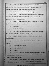 | Keywords: Kenneth Haywood Perjury P137.JPG en Brutal CROSS-EXAMINATION of Kenneth Haywood reveals his previous perjury As you read he was evasive so much so that the COURT Judge Flournoy had to intervene to get him to answer Mr Ledbetter's question directly David Palmer Haywood's attorney seeing that his witness is caught in contradictions intervenes with an objection to this line of questioning Official Court Document Flagstaff AZ Coconinio County Superior Court CV95-00118 Northern Arizona Reporters 418 East Birch Avenue P O Box 22142 Flagstaff AZ 86001 1995-06-06 Kenneth Haywood |