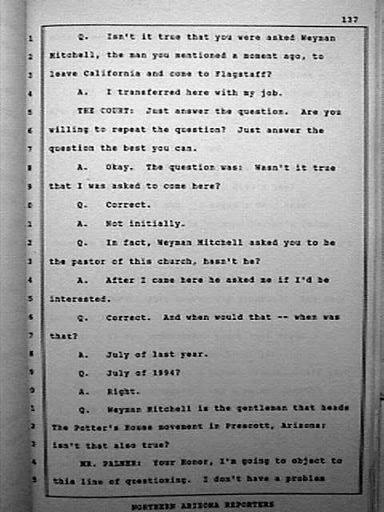 Keywords: Kenneth Haywood Perjury P137.JPG en Brutal CROSS-EXAMINATION of Kenneth Haywood reveals his previous perjury As you read he was evasive so much so that the COURT Judge Flournoy had to intervene to get him to answer Mr Ledbetter's question directly David Palmer Haywood's attorney seeing that his witness is caught in contradictions intervenes with an objection to this line of questioning Official Court Document Flagstaff AZ Coconinio County Superior Court CV95-00118 Northern Arizona Reporters 418 East Birch Avenue P O Box 22142 Flagstaff AZ 86001 1995-06-06 Kenneth Haywood |