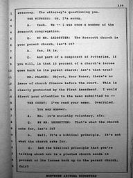 | Keywords: Kenneth Haywood Perjury P139.JPG en Haywood's perjury is being exposed in CROSS-EXAMINATION by Mr Ledbetter Another objection by Mr Palmer Haywood's attorney which is overruled by the Court Ledbetter's questioning continues digging deeper into the financial ties between Haywood's Flagstaff Christian Fellowship Church and that of Wayman Mitchell's parent church in Prescott AZ Official Court Document Flagstaff AZ Coconinio County Superior Court CV95-00118 Northern Arizona Reporters 418 East Birch Avenue P O Box 22142 Flagstaff AZ 86001 1995-06-06 Kenneth Haywood |
