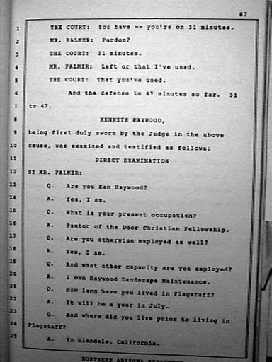 Keywords: Kenneth Haywood Perjury P87.JPG en Page 87 of 247 page Transcript of official court document Official Court Document Flagstaff AZ Coconinio County Superior Court CV95-00118 Northern Arizona Reporters 418 East Birch Avenue P O Box 22142 Flagstaff AZ 86001 1995-06-06 Kenneth Haywood |
