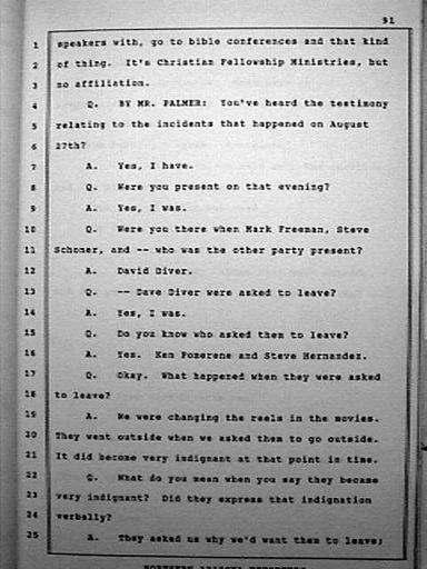 Keywords: Kenneth Haywood Perjury P91.JPG en In line number one Mr Haywood has responded to Judge Flournoy's question line 23 in page 90 where the Judge interrupted the Direct Examination and asks very pointedly Are you connected with any other church Haywood answers that they share speakers with a church called Christian Fellowship Minstries again stating no affiliation Perjury an out and out lie to a direct question by the Judge overseeing this case Official Court Document Flagstaff AZ Coconinio County Superior Court CV95-00118 Northern Arizona Reporters 418 East Birch Avenue P O Box 22142 Flagstaff AZ 86001 1995-06-06 Kenneth Haywood |