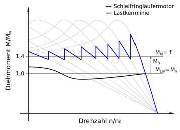 | Keywords: Kennlinie schleifringläufer volllast.svg de de Anlassschwere<br/> M<sub>M</sub> Mittleres Anlassmoment <br/> M<sub>n</sub> Nenndrehmoment <br/> M<sub>Lm</sub> Mittleres Lastmoment <br/> M<sub>B</sub> Resultierendes Beschleunigungsmoment<br/> n<sub>0</sub> Netzfrequenz<br/> Own Biezl Inkscape Electric motor graphs |