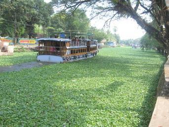 Keywords: Kerala-Backwaters Alppuzha.JPG A ferry wades through water hyacinth in an Alppuzha canal Own 2007-12-24 P K Niyogi Motorboats in India Alappuzha Commuter Boats