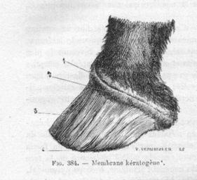 | Keywords: KeratogeneChauveau1890MeyCh.jpg en The keratogenous membrane of the horse Equus caballus fr La membrane kératogène du cheval Equus caballus -1 bourrelet périoplique -2 bourrelet principal ou cutical -3 podophylle tissu podophylleux ou feuilleté -4 villosités de l'extrémité inférieure des feuillets <br /> ” Chauveau Auguste Arloing Saturnin Traité d'anatomie comparée des animaux domestiques <br /> 1 064 p page 910 1890 Paris Lib J B Baillière et Fils domaine public décès des auteurs 1917 et 1911 Meyer Ch 2011-03-22 PD-old Anatomy of horse hooves |