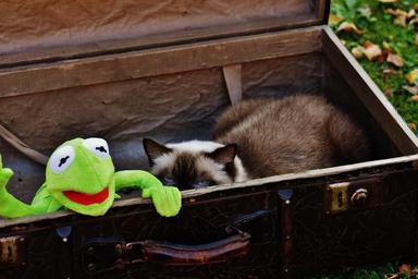 Keywords: kermit cat british shorthair farewell cute children funny sweet luggage antique leather old suitcase junk generations travel go away wave soft toy animal frog stuffed animal