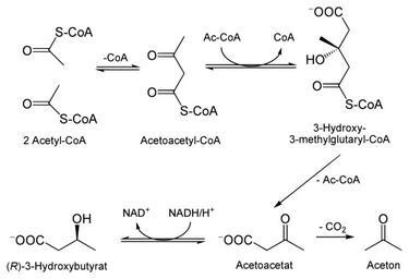 Keywords: Ketone bodies synthesis.svg en Synthesis of ketone bodies from acetyl-CoA de Synthese von sog Ketonkörpern aus Acetyl-CoA Own Yikrazuul 07 06 08 Ketones Carbohydrate metabolism Starvation