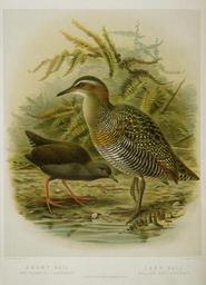 | Keywords: Shows the banded land rail (rallus philippensis) in the right foreground, and the smaller darker red-legged swamp rail (ortygometra tabuensis) at the left. Inscriptions: Inscribed - Recto - bottom right: Judd & Co. Limited, Imp.. Quantity: 1 colour art print(s) in book.. Physical Description: Chromolithograph, 280 x 222 mm Keulemans, John Gerrard, 1842-1912. Keulemans, John Gerrard, 1842-1912 :Swamp rail. Land rail / J. G. Keulemans delt. & lith. [Plate XXXIII. 1888].. Buller, Walter Lawry (Sir) 1838-1906 :A history of the birds of New Zealand. 2d ed. London, John van Voorst, 1888.. Ref: PUBL-0012-33. Alexander Turnbull Library, Wellington, New Zealand. natlib.govt.nz/records/22318774 Shows the banded land rail (rallus philippensis) in the right foreground, and the smaller darker red-legged swamp rail (ortygometra tabuensis) at the left. Inscriptions: Inscribed - Recto - bottom right: Judd & Co. Limited, Imp.. Quantity: 1 colour art print(s) in book.. Physical Description: Chromolithograph, 280 x 222 mm Keulemans, John Gerrard, 1842-1912. Keulemans, John Gerrard, 1842-1912 :Swamp rail. Land rail / J. G. Keulemans delt. & lith. [Plate XXXIII. 1888].. Buller, Walter Lawry (Sir) 1838-1906 :A history of the birds of New Zealand. 2d ed. London, John van Voorst, 1888.. Ref: PUBL-0012-33. Alexander Turnbull Library, Wellington, New Zealand. natlib.govt.nz/records/22318774 |