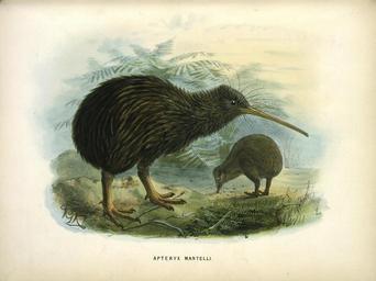 | Keywords: animal bird A pair of kiwi, with ferns behind. The nearer bird is side-on, its head pointing to the right; the more distant bird has its beak plunged into the ground Quantity: 1 colour art print(s). Physical Description: Lithograph, hand-coloured, 240 x 312 mm Keulemans, John Gerrard, 1842-1912. Keulemans, John Gerrard, 1842-1912 :Apteryx Mantelli [North Island kiwi] London, 1873. Buller, Walter Lawry (Sir) 1838-1906 :A history of the birds of New Zealand. 1st ed. London, 1873. Ref: PUBL-0134-358. Alexander Turnbull Library, Wellington, New Zealand. natlib.govt.nz/records/23031923 A pair of kiwi, with ferns behind. The nearer bird is side-on, its head pointing to the right; the more distant bird has its beak plunged into the ground Quantity: 1 colour art print(s). Physical Description: Lithograph, hand-coloured, 240 x 312 mm Keulemans, John Gerrard, 1842-1912. Keulemans, John Gerrard, 1842-1912 :Apteryx Mantelli [North Island kiwi] London, 1873. Buller, Walter Lawry (Sir) 1838-1906 :A history of the birds of New Zealand. 1st ed. London, 1873. Ref: PUBL-0134-358. Alexander Turnbull Library, Wellington, New Zealand. natlib.govt.nz/records/23031923 |