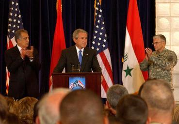 | Keywords: Khalilzad-Bush-Casey in 2006.jpg Zalmay Khalilzad left U S Ambassador to Iraq and Gen George Casey right commanding general Multinational Forces-Iraq applaud President George W Bush as he commends U S and coalition forces for their continuing efforts in Iraq June 13 2006 at a former presidential palace of Saddam Hussein in Baghdad's International Zone U S Navy photo by Petty Officer 1st Class Darrell Crandall http //www defenselink mil/homepagephotos/homepagephotos aspx month 200606 U S Department of Defense direct link to image http //www defenselink mil/dodcmsshare/homepagephoto 5C2006-06 5Chires_060613-N-0000X-001a jpg here 2006-06-13 Petty Officer 1st Class Darrell Crandall PD-USGov-Mil-Navy Zalmay Khalilzad George W Casey Jr George W Bush in 2006 |