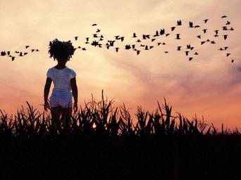 Keywords: kids girls child sunset twilight birds fly grass grassland small fresh cute silhouette standing distance hope views