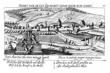 | Keywords: Kieser Staden 1627.jpg de STADEN in der Wetteraw aus Daniel Meisner/ Eberhard Kieser Thesaurus Philopoliticus oder Politisches Schatzkästlein Bd 2 Faksimile-Neudruck der Ausgabe Frankfurt/ Main 1625-1626 u 1627-1631 Nördlingen 1992 Buch 1 Nr 45 http //www lagis-hessen de/de/subjects/idrec/sn/oa/id/724 creator Eberhard Kieser 1627 Staden Florstadt Thesaurus Philopoliticus PD-old-100 | ||||
