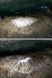 | Keywords: Kilimanjaro glacier retreat.jpg These two images taken by NASA show the changes in snow accumulations on the summit of Mount Kilimanjaro The top image was photographed on February 17 1993 and the lower one was photographed on February 21 2000 Retrieved from http //ocrl kordi re kr/directory/20021224e html Earth Observatory News Nasa and as a U S Government image it is within the public domain PD-USGov Kilimanjaro Satellite pictures of Tanzania Global warming Retreat of glaciers Glaciers of Kilimanjaro |